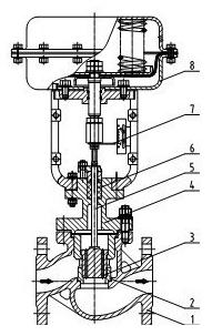 1、閥體 2、套筒 3、閥芯 4、閥蓋 5、閥桿 6、填料 7、指示盤(pán) 8、執(zhí)行機(jī)構(gòu)