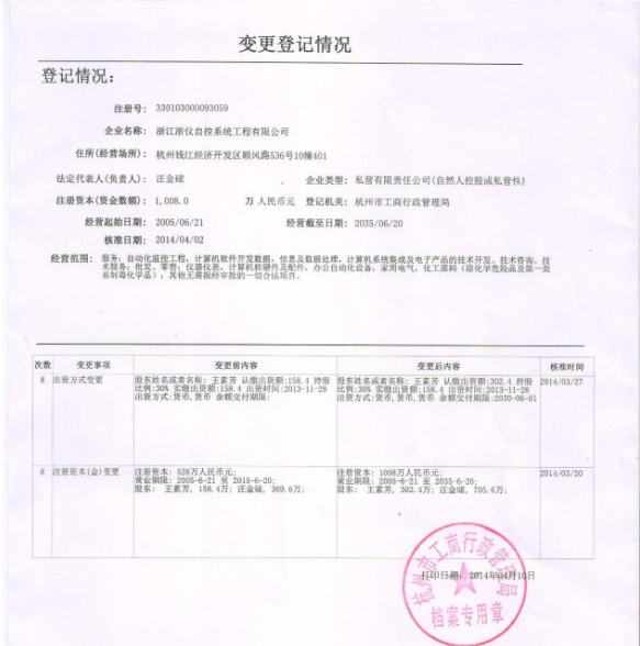杭州浙儀自控系統(tǒng)工程有限公司于2013年12月從注冊(cè)資金108萬(wàn)增資為528萬(wàn),現(xiàn)為了公司發(fā)展需要,更好的拓展市場(chǎng)服務(wù)客戶,在2014年3月增資到1008萬(wàn)元整。